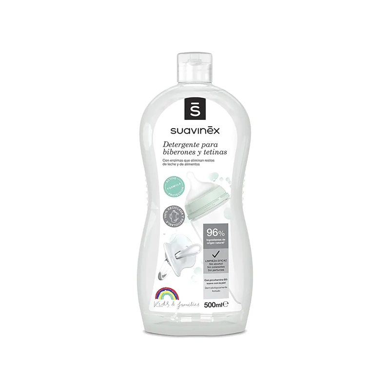 Detergjenti për biberonë dhe tetina Suavinex pastron në thellësi mbetjet e qumështit, qullit dhe lëngjeve, si dhe çdo gjurmë ushqimi nga enët e foshnjës (filxhanë, pjata, lugë). Idealisht përdoret edhe për pastrimin e pompave të gjirit, biberonëve, lodrave për dhëmbëzimin dhe sonajave. Përmban 82% përbërës me origjinë natyrale dhe ka një teksturë xheli që lejon dozimin e saktë pa humbje produkti. Formula me enzima eliminon në mënyrë efektive mbetjet e qumështit dhe ushqimit.
