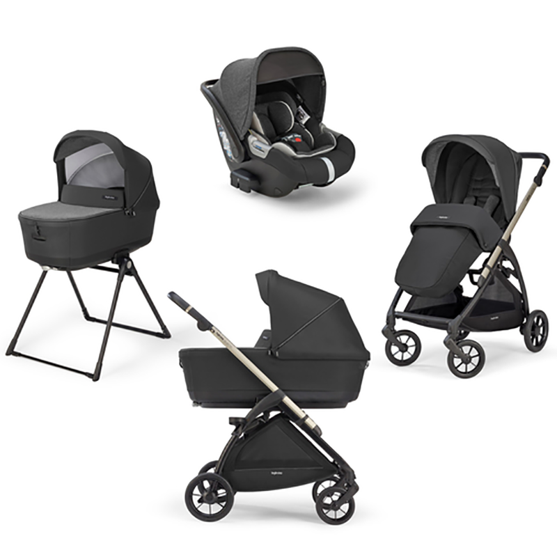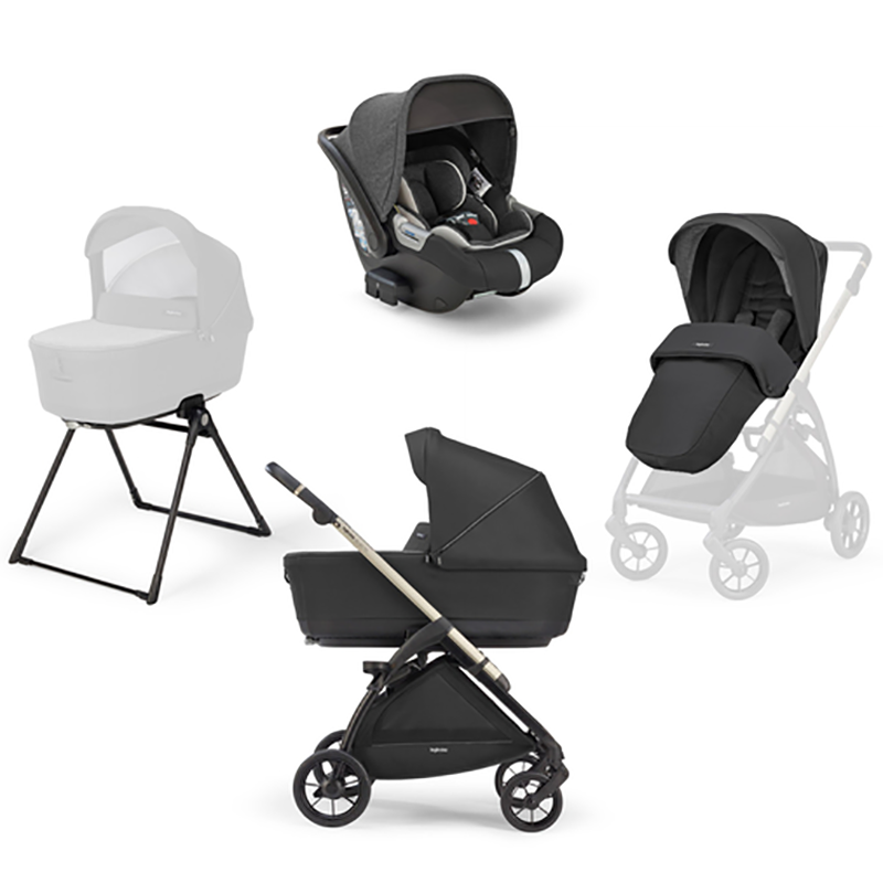 Shasi, sedilje karroce, gondolë (carrycot), mbulesë këmbësh (footmuff), stand, shportë ruajtjeje, mbajtëse për gotë dhe sedilje makine për bebe Darwin i-Size me bazë i-Size.