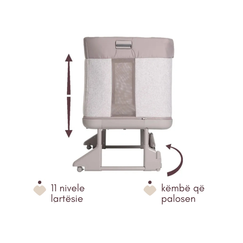Falë 4 rrotave të lëvizshme me frenues, krevatin mund ta lëvizni shumë lehtë. Ka rrjetë gjatë të gjitha anëve për ventilim optimal. Lartësia e krevatit mund të rregullohet në 11 nivele të ndryshme për t’u përshtatur me çdo shtrat, ndërsa këmbët e palosshme e bëjnë të përshtatshëm edhe për shtretër me sirtarë. Për më tepër, kjo kolibë mund të rregullohet në kënd për të ndihmuar në parandalimin e të vjellave dhe për të lehtësuar frymëmarrjen, edhe në rast të ngushtimit të hundës.