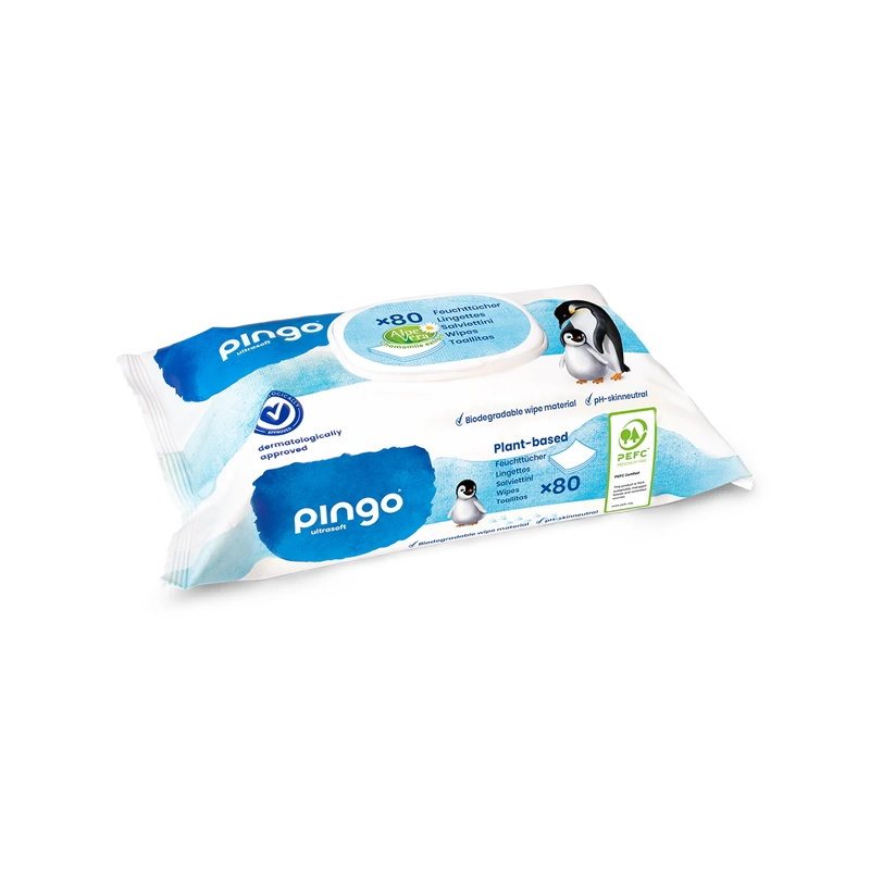 Letra të lagura të buta për pastrimin e lëkurës të bebit tuaj. Letrat e lagura Pingo janë ekologjike, të çertifikuara me një locion me bazë Coco Glucoside (sapun i butë me origjinë natyrale), Aloe Vera dhe kamomil. Nuk përmban parfum, fenoksietanol, paraben, emulsifikues PEG.
