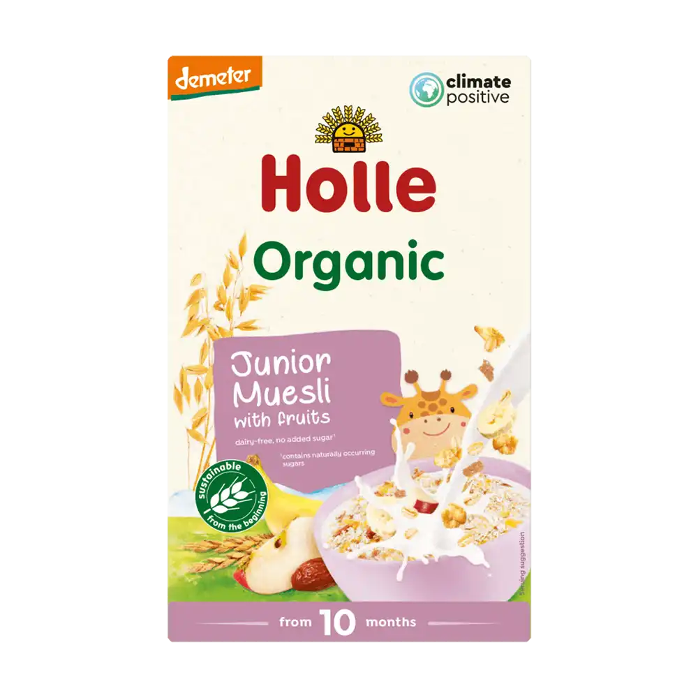Holle Organic Junior Muesli Multigrain with Fruit 10 Months+ është një përzierje e shijshme e drithërave integrale të përzgjedhura me kujdes. Shtimi i qumështit i bën më të buta dhe të lehta për tu përtypur. Përbërësit janë të cilësisë më të mirë Demeter dhe garantojnë një shije unike.