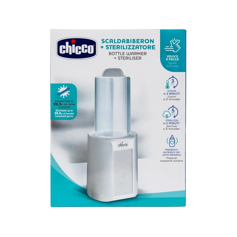 I shpejtë, praktik dhe i saktë, ngrohësi i ri i biberonave Chicco kombinon dy funksione në një pajisje: ngrohjen e formulave, qumështit të gjirit dhe kavanozëve të ushqimit për fëmijë, si dhe sterilizimin e shisheve dhe aksesorëve.