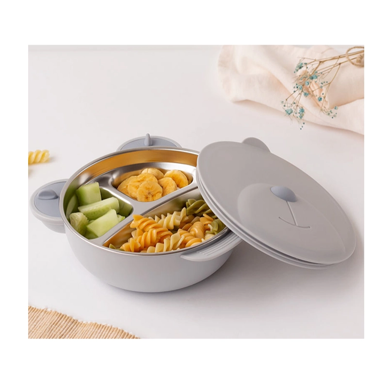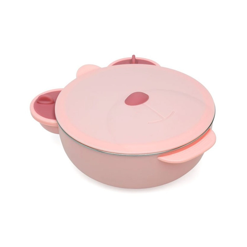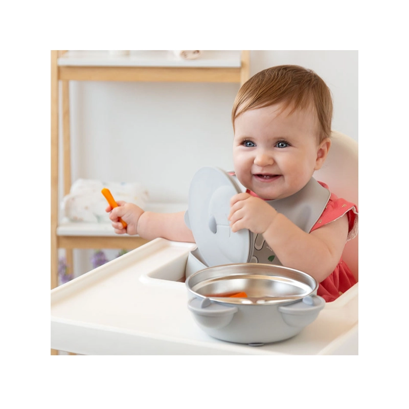 Pjesa e brendshme është prej çeliku inox, e përshtatshme për kontakt me ushqimin. Falë bazës me thithëse kundër rrëshqitjes, tasi qëndron i fiksuar në tavolinë ose në karrigen e bebit, perfekt për fëmijët që fillojnë të hanë vetë.